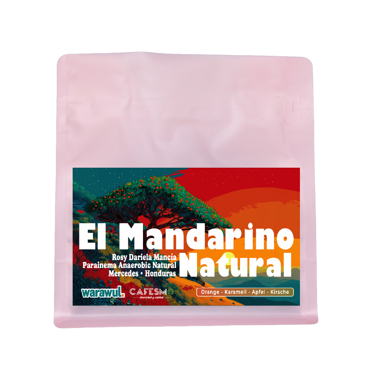 El Mandarino Natural ist ein außergewöhnlicher Arabica der Sorte Parainema. Er wird von Rosy Dariela Mancía und ihrem Ehemann Roy Hernández im bergigen Südwesten von Honduras angebaut. Die sorgfältige anaerobe Natural-Aufbereitung verleiht ihm ein intensives und fruchtbetontes Profil.